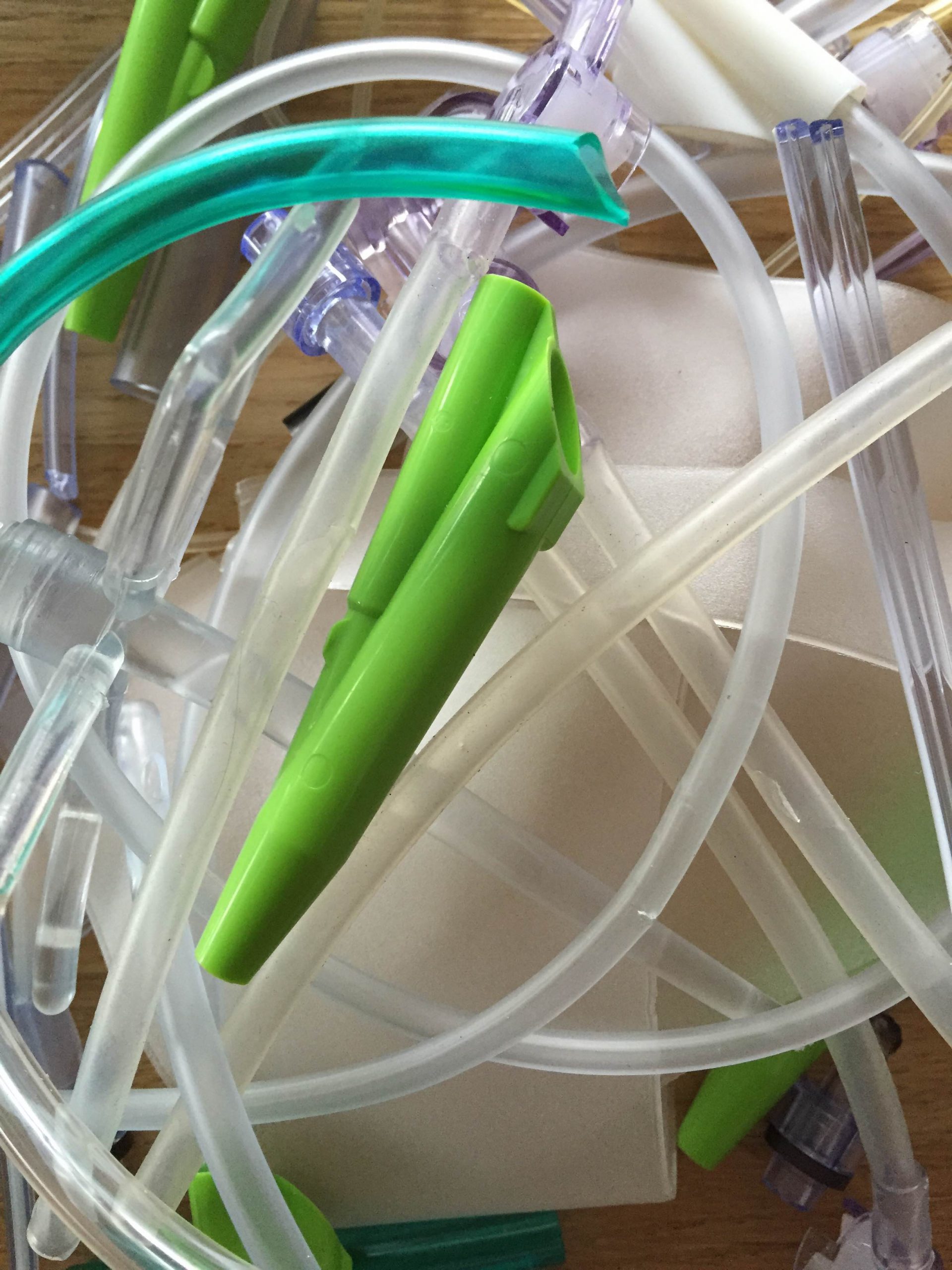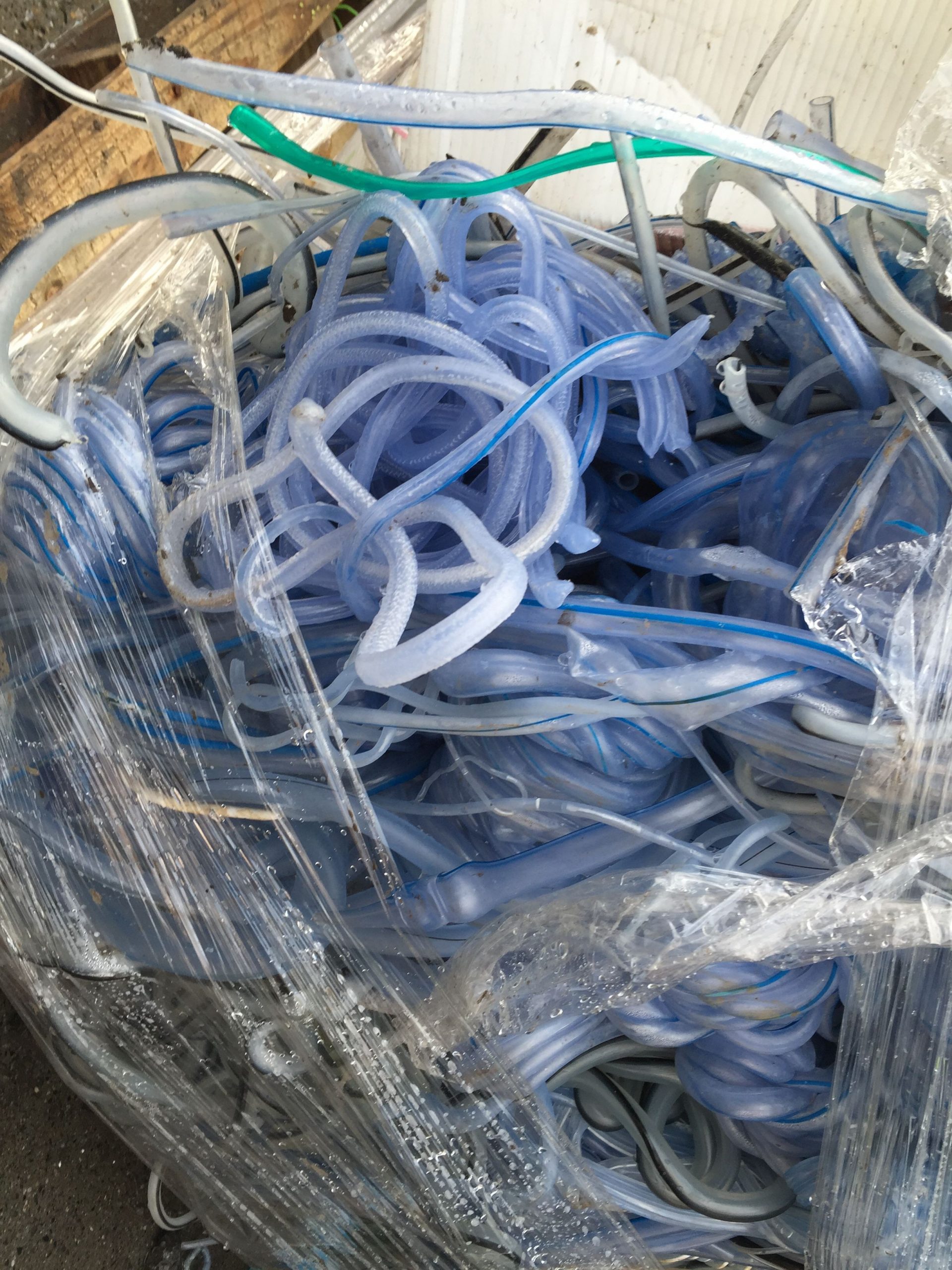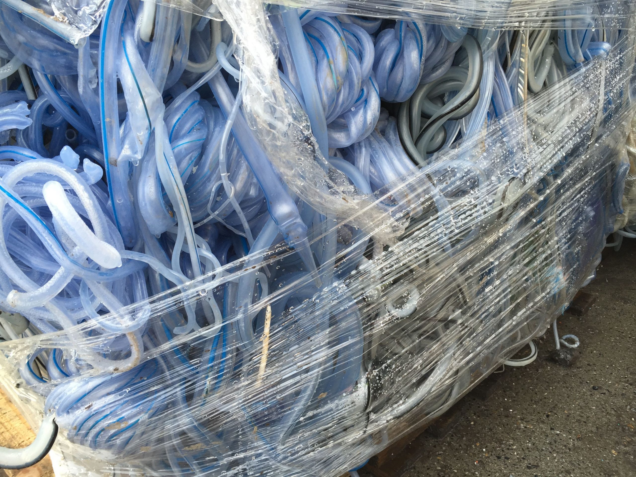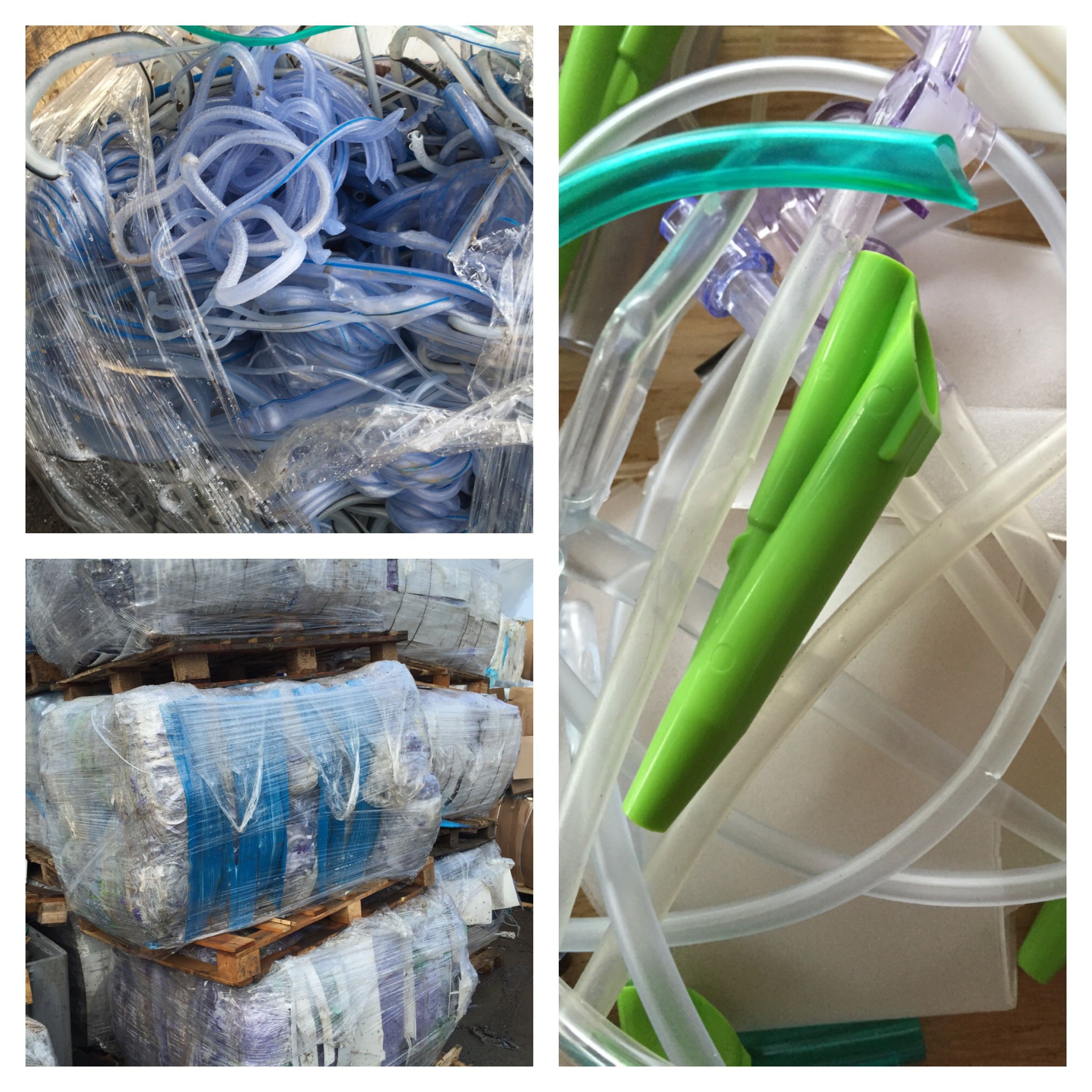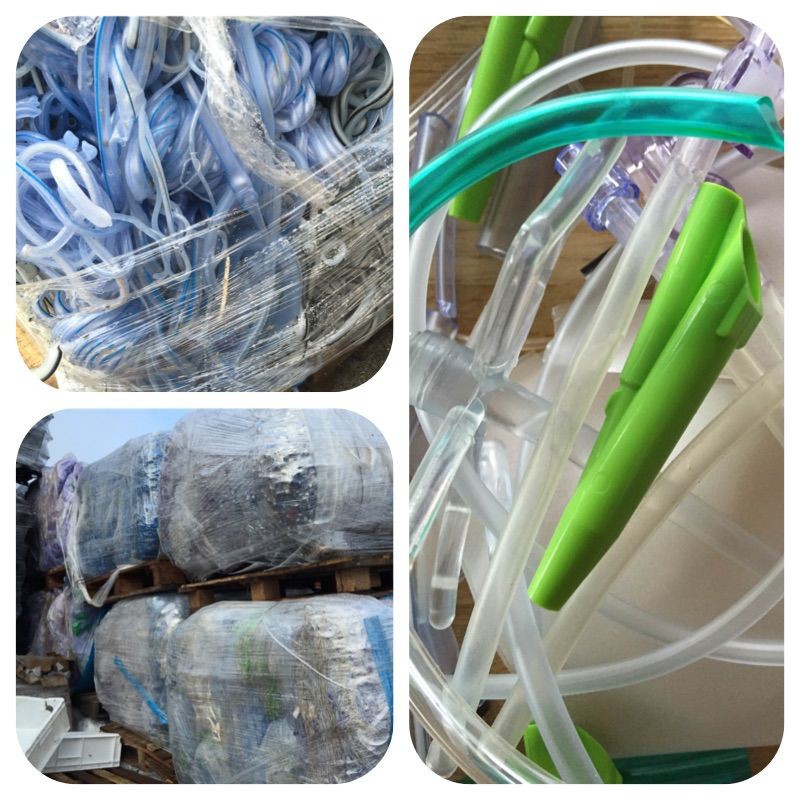 Clean post-industrial healthcare PVC with attachments. Quality with around 75% soft pvc from tubing or bags and 25% hard pvc.